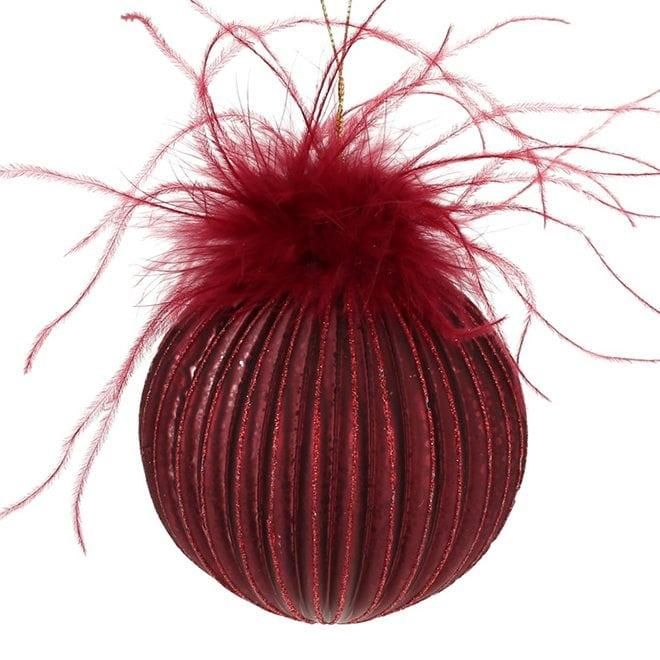 Набор стеклянных шариков рельефной формы с декором из перьев и глитера 10 см, цвет - бордовый.