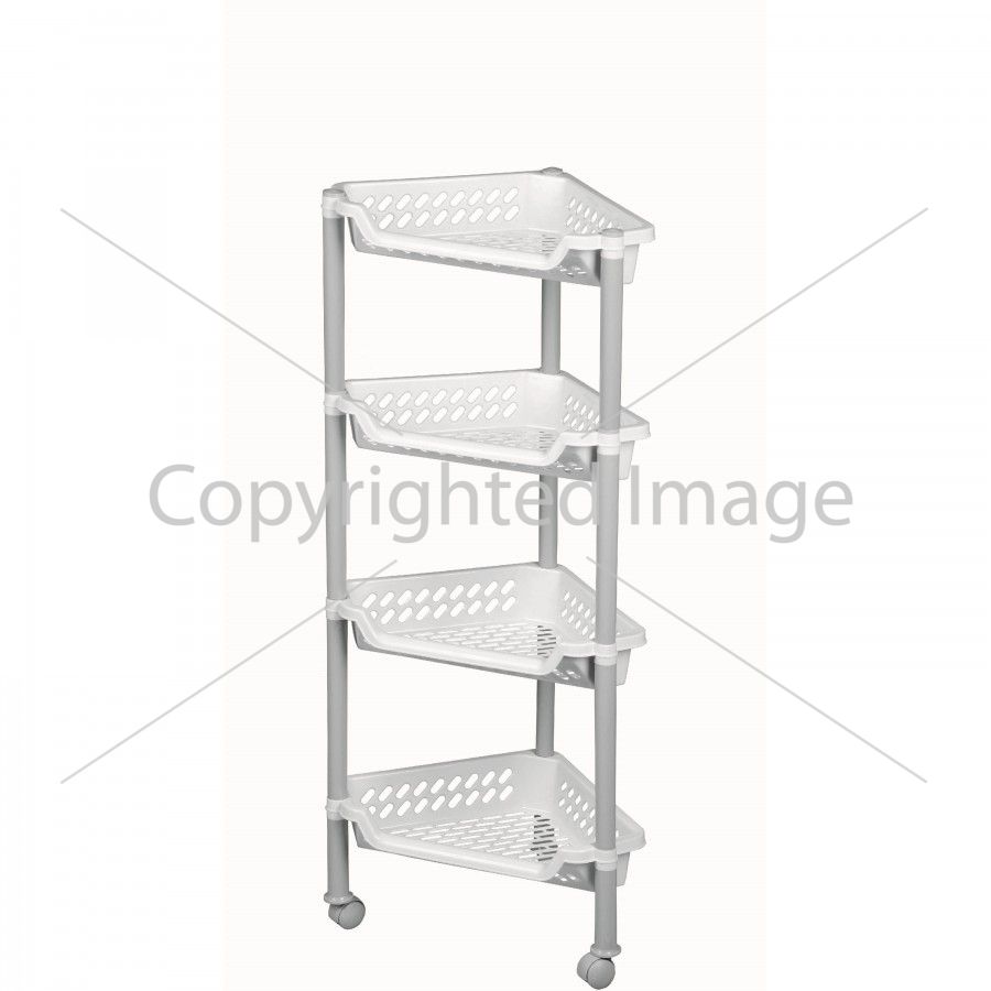 Етажерка Plast Team кутова більша на коліщатках Мармур - трикутної форми, що ідеально вписується в кут ванної або спальні. Кошики з відкритими стінками забезпечують кращу вентиляцію та можливість стікання води при використанні у вологих приміщеннях, наприклад, у вологих приміщеннях. ванна кімната. Колеса забезпечують легке переміщення візка.