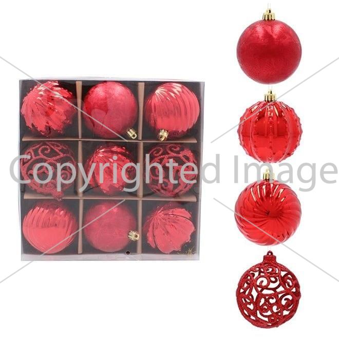 Набір пластикових ялинкових куль, колір червоний, 9 шт. діаметром – 8 см: фігурний глянсовий – 5 шт. матовий – 2 шт. фігурний глітер – 2 шт.