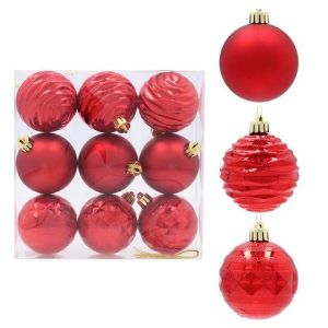 Набір пластикових ялинкових куль, колір червоний, 9 шт. діаметром – 6 см: фігурний глянсовий – 6 шт. матовий – 3 шт.