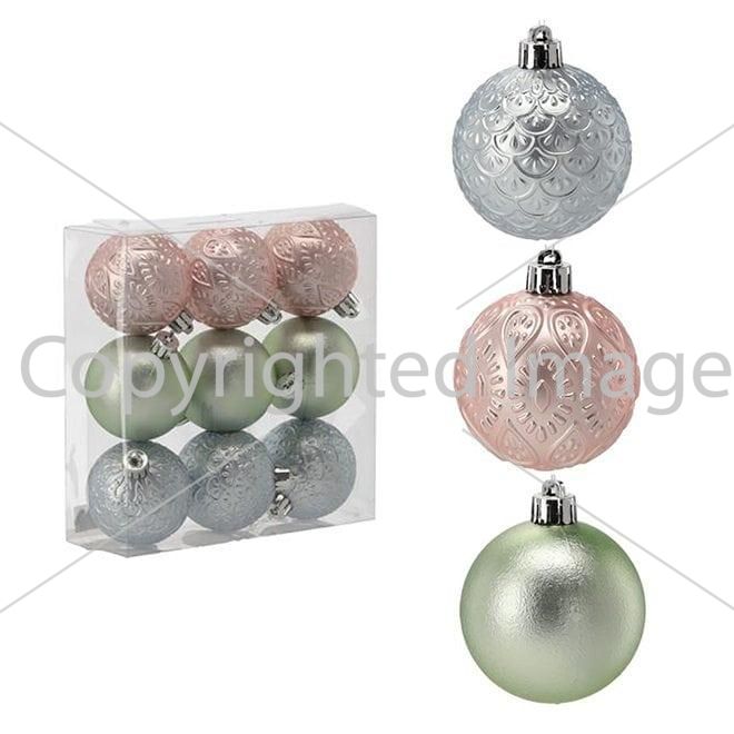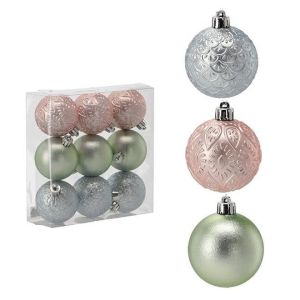 Набір пластикових ялинкових куль, колір – рожевий фігурний – 3 шт. срібний фігурний – 3 шт. м'ятний матовий – 3 шт. діаметром – 6 см.