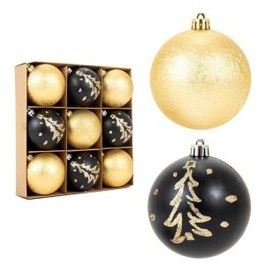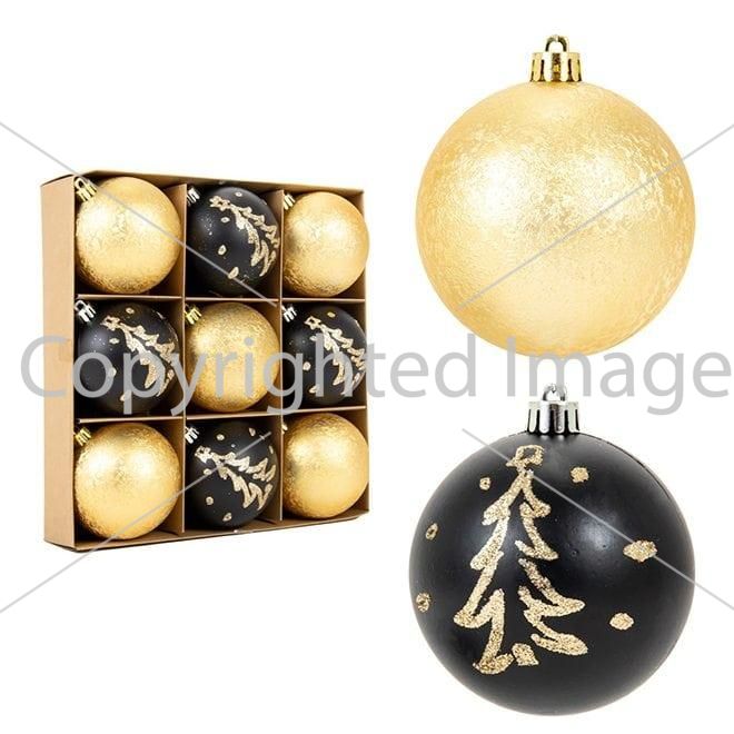 Набір пластикових ялинкових кульок, колір – золотий матовий – 5 шт. чорний матовий із візерунком – 4 шт. діаметром – 8 см.