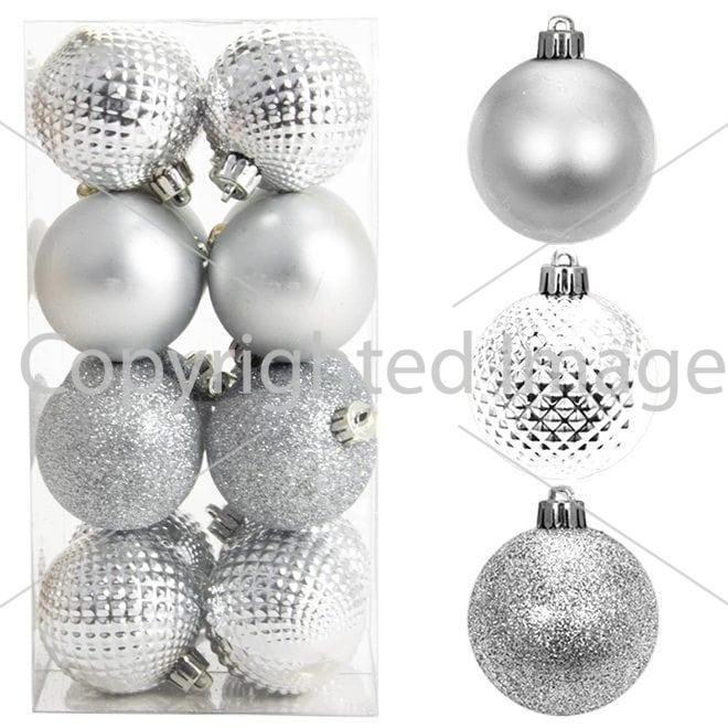 Набір пластикових ялинкових куль, колір срібний, 16 шт. діаметром – 6 см: фігурний глянсовий – 8 шт. матовий – 4 шт. глітер – 4 шт.