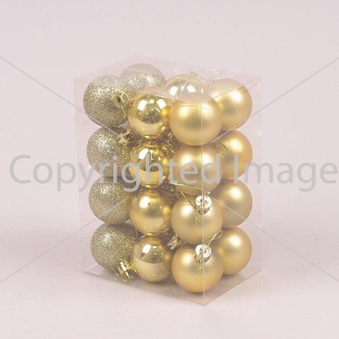 Набір пластикових ялинкових куль, колір золотий, 24 шт. діаметром - 4 см: 8 шт. - глянець, 8 шт. - Глітер, 8 шт. - Матовий.
