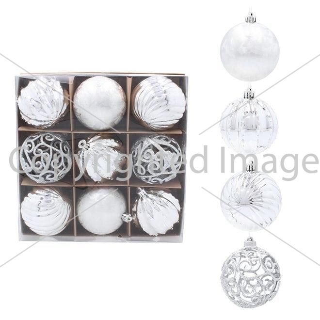 Набір пластикових ялинкових куль, колір срібний, 9 шт. діаметром – 8 см: фігурний глянсовий – 5 шт. матовий – 2 шт. фігурний глітер – 2 шт.