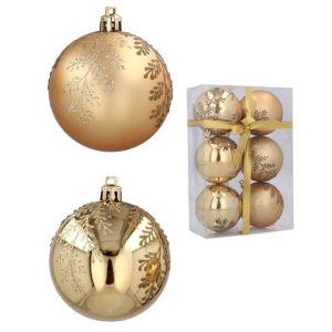 Набір пластикових ялинкових куль, колір золотий, 6 шт. діаметром – 7 см: матовий із золотим візерунком – 3 шт. глянсовий із золотим візерунком – 3 шт.