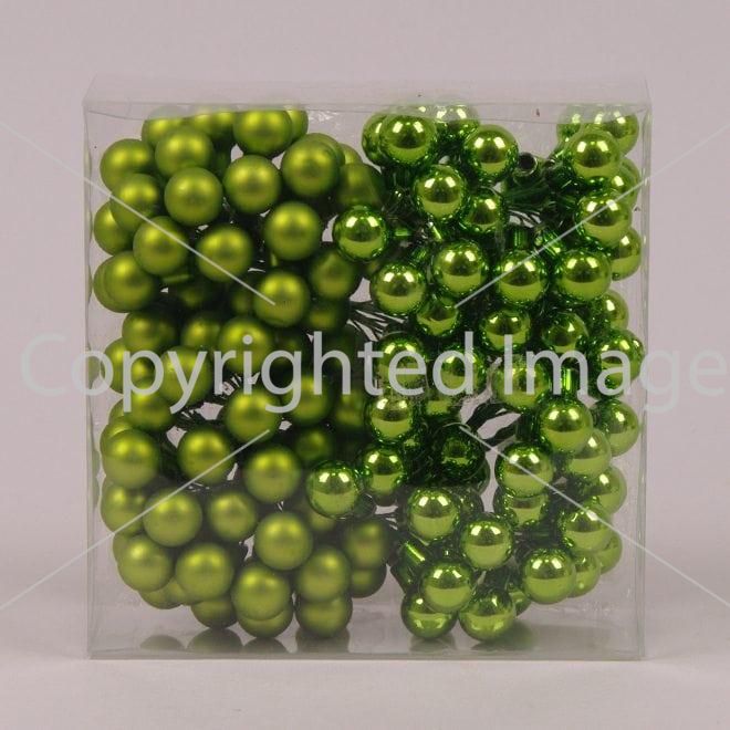 Скляні кульки зеленого кольору на дроті утворюють невеликий пучок, у ньому з'єдналися 12 скляних кульок. В упаковці два види пучків 6 з матовими кульками та 6 з глянсовими. Такі маленькі скляні кульки обов'язково стануть у нагоді флористам і декораторам, зібравши їх у пучок і доповнивши гілками хвої, намистами, стрічками або іншим декором, вони створять унікальні новорічні прикраси!