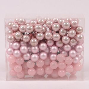 Скляні кульки рожевого кольору на дроті утворюють невеликий пучок, у ньому поєдналися 12 скляних кульок. В упаковці три види пучків. Такі маленькі скляні кульки обов'язково стануть у нагоді флористам і декораторам, зібравши їх у пучок і доповнивши гілками хвої, намистами, стрічками або іншим декором, вони створять унікальні новорічні прикраси!