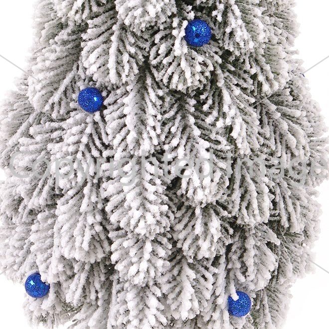 Елка литая на деревянной подставке заснеженная с синими шариками 62 см.