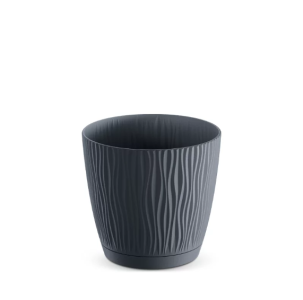 Горшок пластмассовый антрацитового цвета из коллекции SANDY с волнообразной поверхностью, сформированной по образцу пустынного песка. Оснащен подставкой с системой самоблокировки.