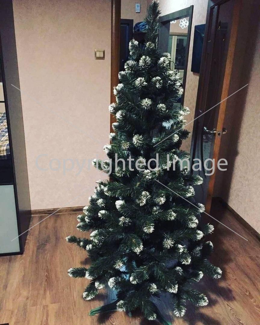Представленная модель высотой 120 см выполнена из ПВХ зелёного цвета с белыми кончиками, длина иголочек составляет 4 см. Она имеет конусную форму с нижним диаметром 88 см и достаточное количество пышных веток, на которые свободно помещаются новогодние игрушки.