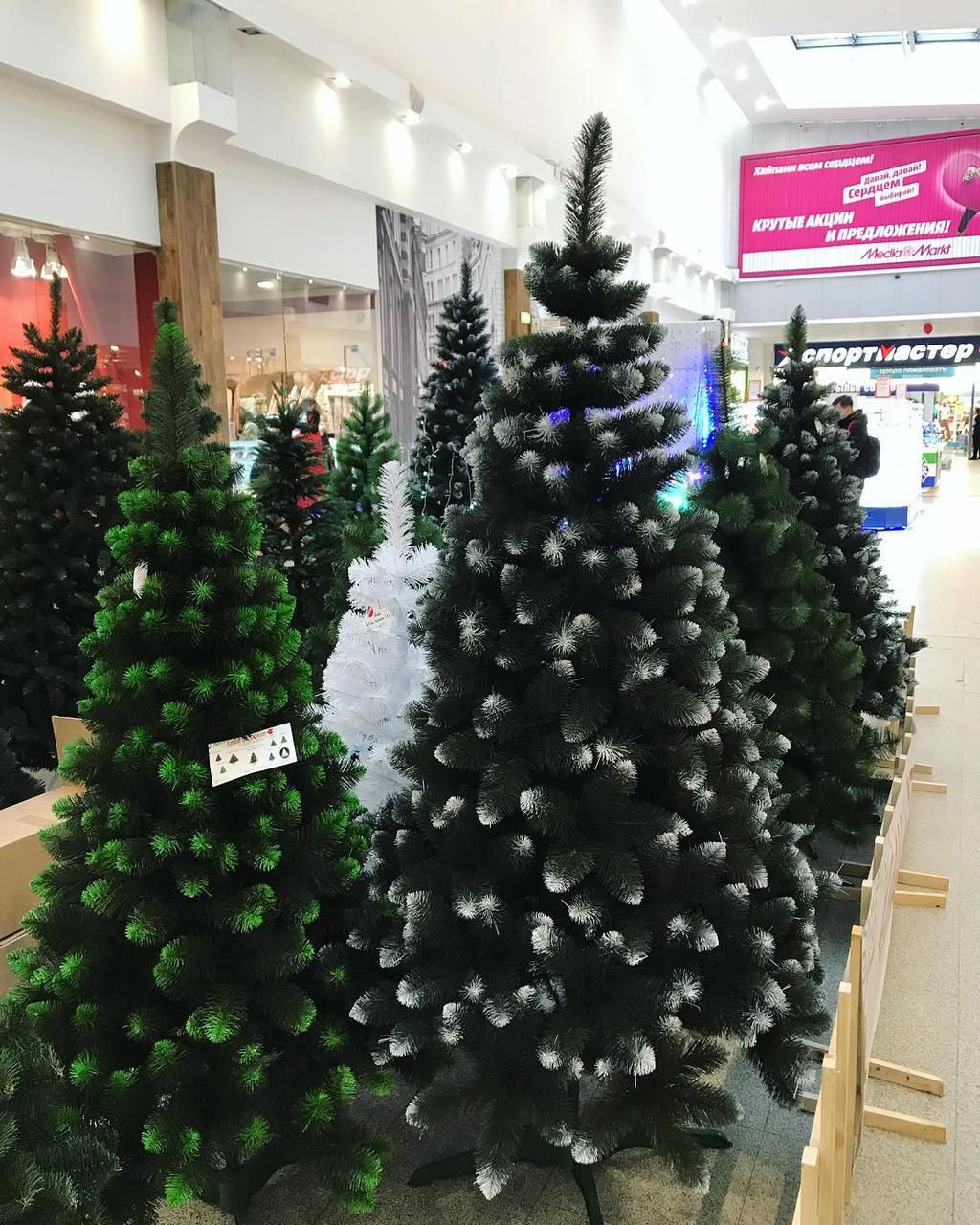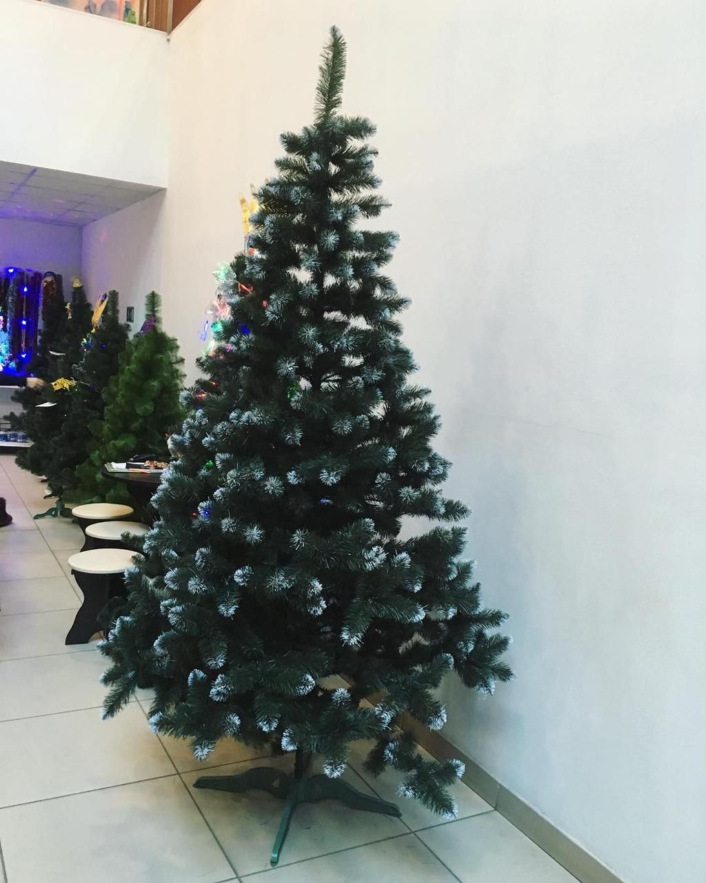 Представленная модель высотой 2,2 метра выполнена из ПВХ зелёного цвета с белыми кончиками, длина иголочек составляет 4 см. Она имеет конусную форму с нижним диаметром 150 см и достаточное количество пышных веток, на которые свободно помещаются новогодние игрушки.