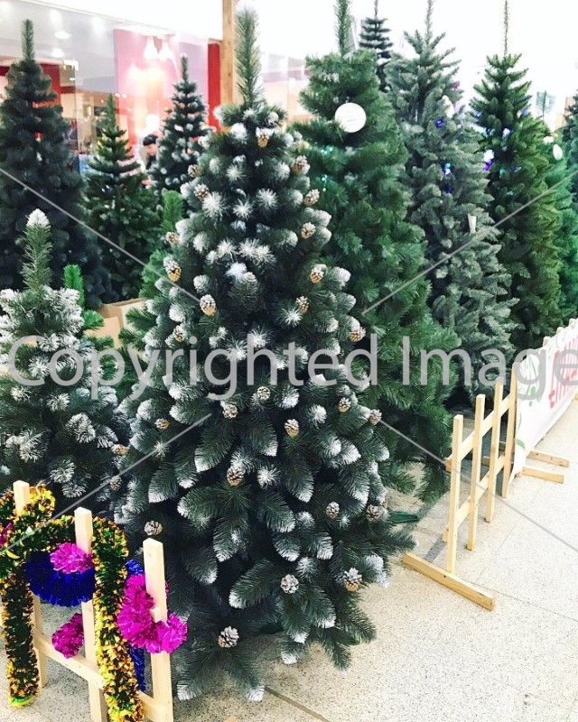 Представленная модель высотой 2,5 метра выполнена из ПВХ зелёного цвета и украшена белыми кончиками и шишками, длина иголочек составляет 4,5 см. Она имеет конусную форму с нижним диаметром 154 см и достаточное количество пышных веток, на которые свободно помещаются новогодние игрушки.