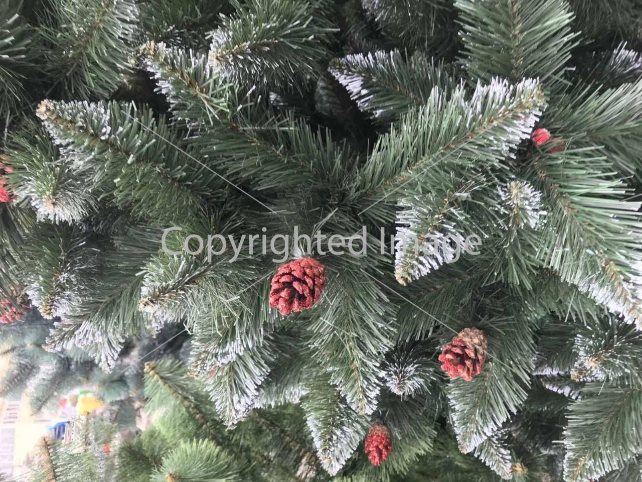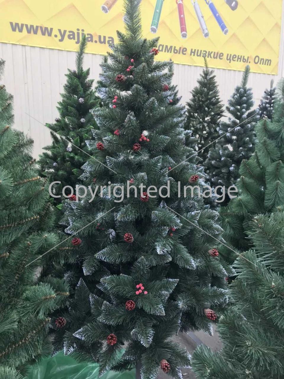 Представленная модель высотой 2,5 метра выполнена из ПВХ зелёного цвета с белыми кончиками, а также декорируется шишками и ягодами калины. Длина иголочек составляет 4,5 см. Она имеет конусную форму с нижним диаметром 154 см и достаточное количество пышных веток, на которые свободно помещаются новогодние игрушки.