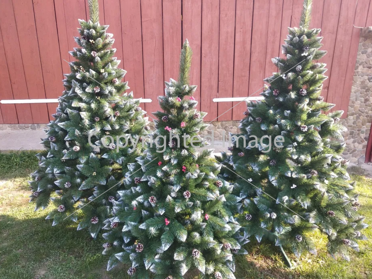 Представленная модель высотой 1,5 метра выполнена из ПВХ зелёного цвета с белыми кончиками, а также декорируется шишками и ягодами калины. Длина иголочек составляет 4,5 см. Она имеет конусную форму с нижним диаметром 86 см и достаточное количество пышных веток, на которые свободно помещаются новогодние игрушки.