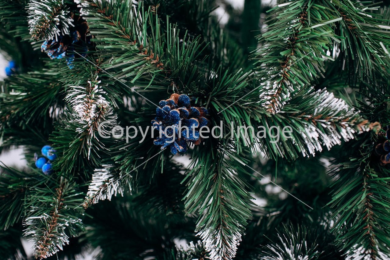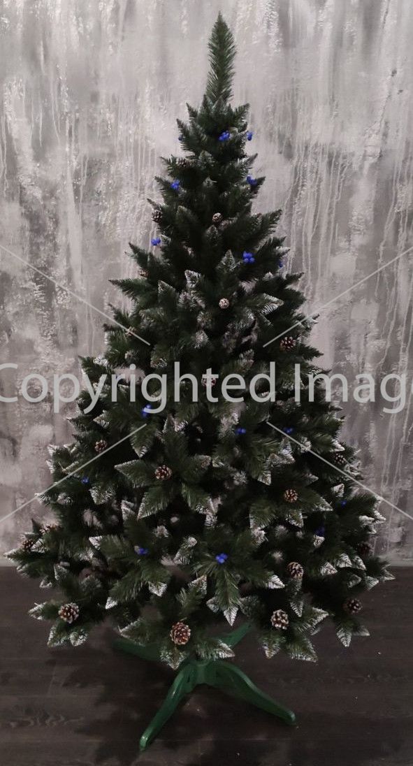 Искусственная ель РОЖДЕСТВЕНСКАЯ с белыми кончиками, шишками и калиной синей 150 см