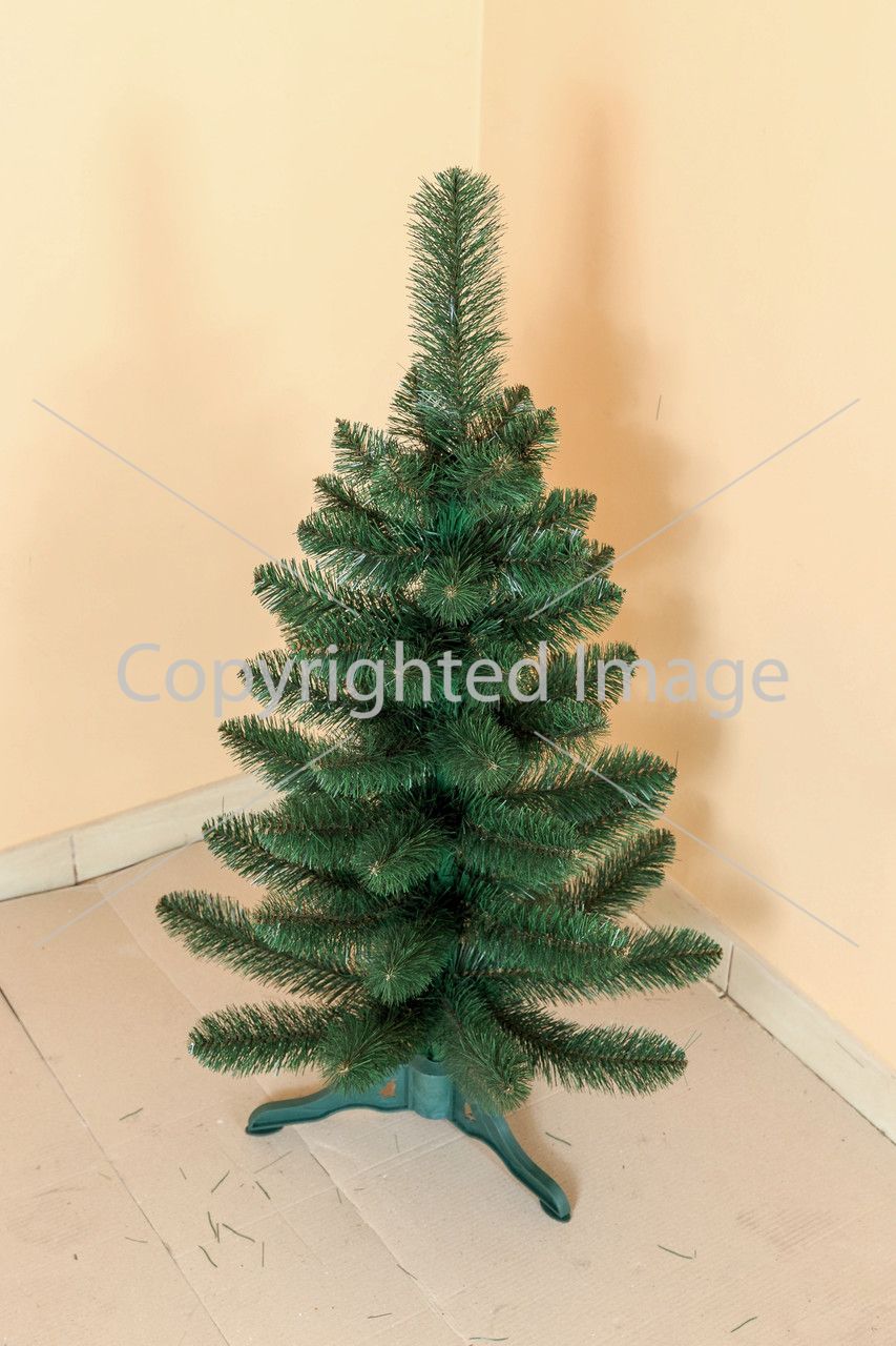 Представленная модель высотой 1,2 метр выполнена из ПВХ зелёного цвета, длина иголочек составляет 4 см. Она имеет конусную форму с нижним диаметром 90 см и достаточное количество пышных веток, на которые свободно помещаются новогодние игрушки.