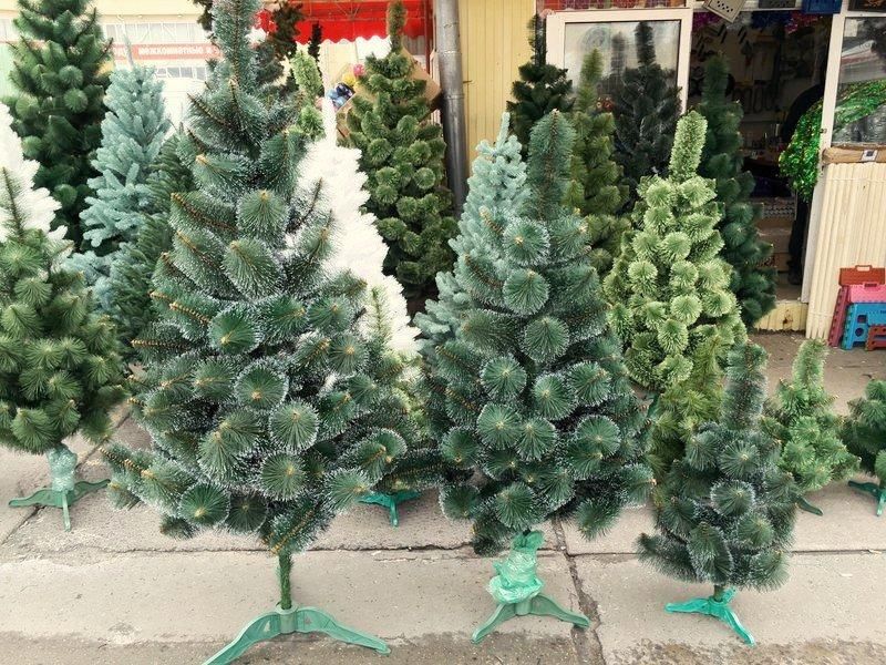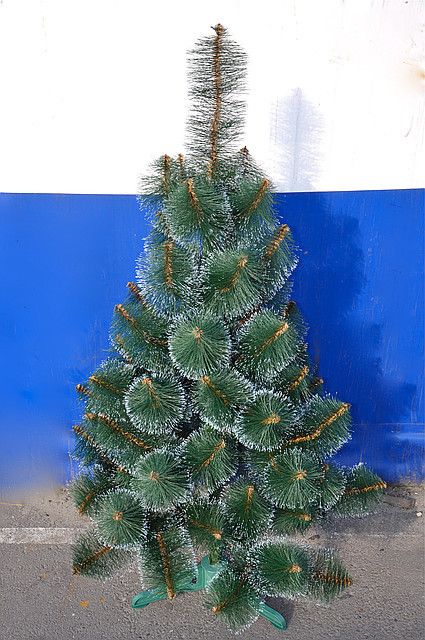 Представленная модель высотой 2,5 метра выполнена из ПВХ тёмно-зелёного цвета с заснеженными кончиками, длина иголочек составляет 6 см. Она имеет конусную форму с нижним диаметром 152 см и достаточное количество пышных веток, на которые свободно помещаются новогодние игрушки.