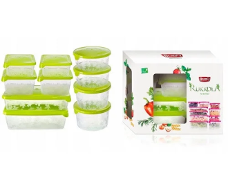 В набор входят 10 контейнеров для хранения продуктов, а именно: Емкость прямоугольная вместимостью 1,35 л: 2 шт. - длина: 20,0 см - ширина: 14,0 см - высота: 6,5 см Емкость прямоугольная вместимостью 0,9 л: 2 шт. - длина: 20,0 см - ширина: 14,0 см - высота: 4,5 см Квадратный контейнер емкостью 0,75 л: 1 шт. - длина: 11,0 см - ширина: 11,0 см - высота: 8,0 см Квадратный контейнер емкостью 0,45 л: 3 шт. - длина: 11,0 см - ширина: 11,0 см - высота: 5,5 см Круглый контейнер емкостью 0,75 л: 1 шт. - диаметр: 13,0 см - высота: 7,5 см Круглый контейнер емкостью 0,5 л: 1шт. - диаметр: 13,0 см - высота: 5,5 см
