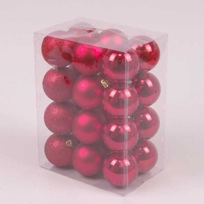 Набор пластиковых елочных шаров, цвет – красный, 24 шт. диаметром – 5 см: 8 шт. - глянец, 8 шт. – глиттер, 8 шт. – матовый.