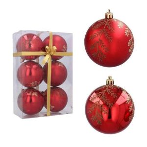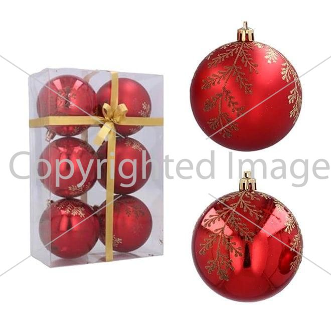 Набор пластиковых елочных шаров, цвет – красный, 6 шт. диаметром – 8 см: матовый с золотым узором – 3 шт. глянцевый с золотым узором – 3 шт.