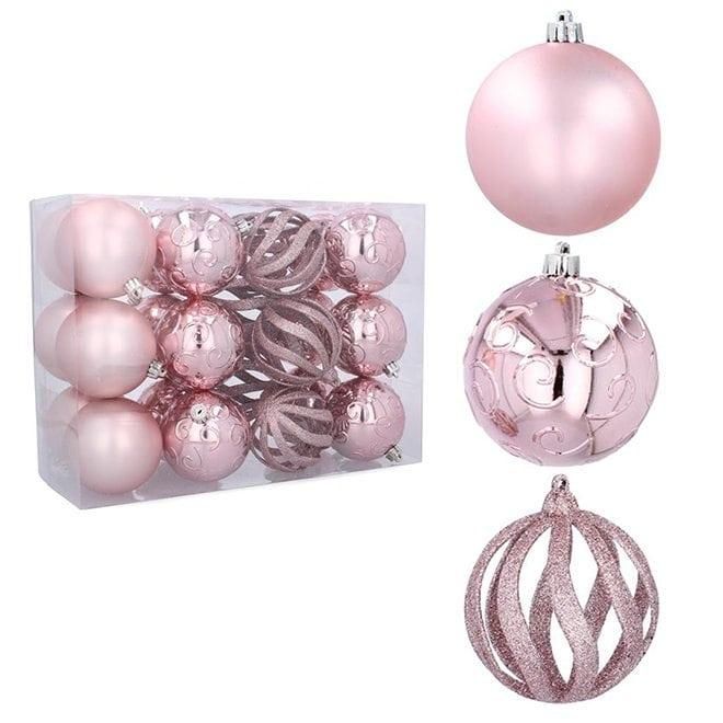 Набор пластиковых елочных шаров, цвет – розовый, 24 шт. диаметром – 8 см: 6 шт. – матовый, 12 шт. – глянцевый фигурный, 6 шт. - фигурный глиттер.