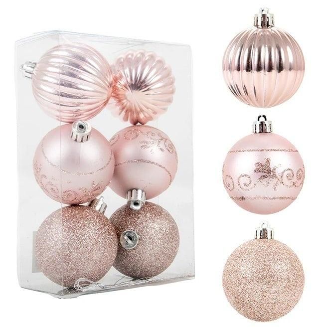 Набор пластиковых елочных шаров, цвет – розовый, 6 шт. диаметром – 6 см: фигурный глянцевый – 2 шт. матовый с узором – 2 шт. глиттер – 2 шт.