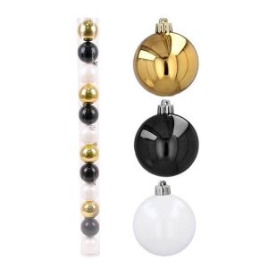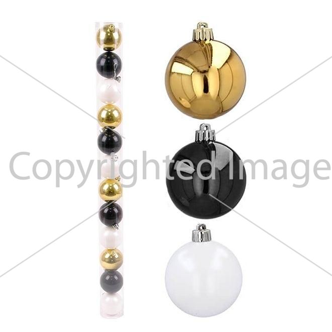 Набор пластиковых елочных шаров, цвет – белый матовый – 4 шт. золотой глянцевый – 4 шт. черный глянцевый – 4 шт. диаметром – 6 см.