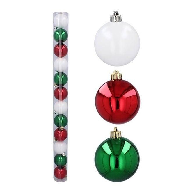 Набор пластиковых елочных шаров, цвет – белый матовый – 4 шт. зеленый глянцевый – 4 шт. красный глянцевый – 4 шт. диаметром – 6 см.