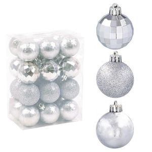 Набор пластиковых елочных шаров, цвет – серебряный, 24 шт. диаметром – 4 см: 6 шт. - фигурный глянцевый, 6 шт. - глиттер, 12 шт. – матовый.