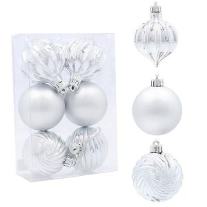 Набор пластиковых елочных шаров, цвет – серебряный, 6 шт. диаметром – 6 см: фигурный глянцевый – 4 шт. матовый – 2 шт.