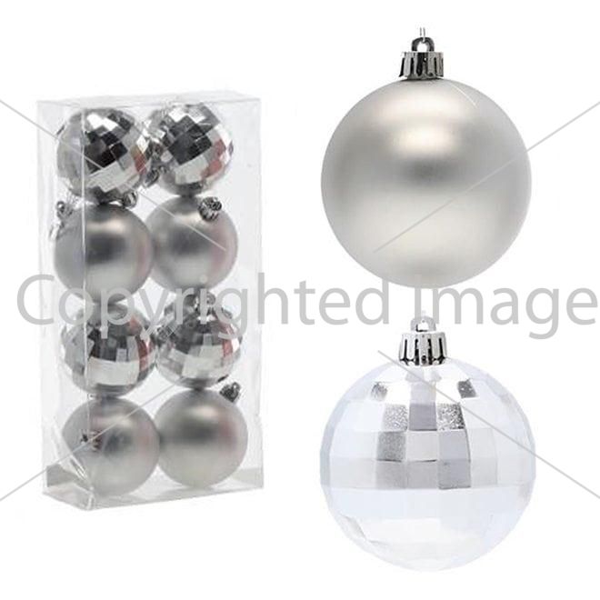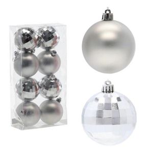 Набор пластиковых елочных шаров, цвет – серебряный, 8 шт. диаметром – 7 см: фигурный глянцевый – 4 шт. матовый – 4 шт.