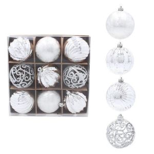 Набор пластиковых елочных шаров, цвет – серебряный, 9 шт. диаметром – 8 см: фигурный глянцевый – 5 шт. матовый – 2 шт. фигурный глиттер – 2 шт.
