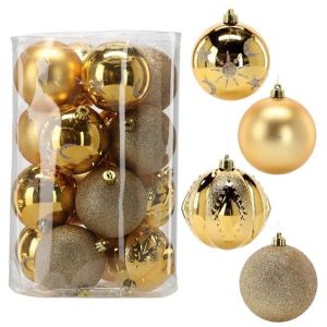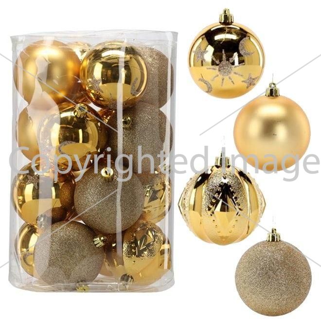 Набор пластиковых елочных шаров, цвет – золотой, 16 шт. диаметром – 8 см: 4 шт. – глянец с узором, 4 шт. – матовый, 4 шт. – фигурный, 4 шт. - глиттер.