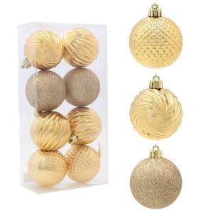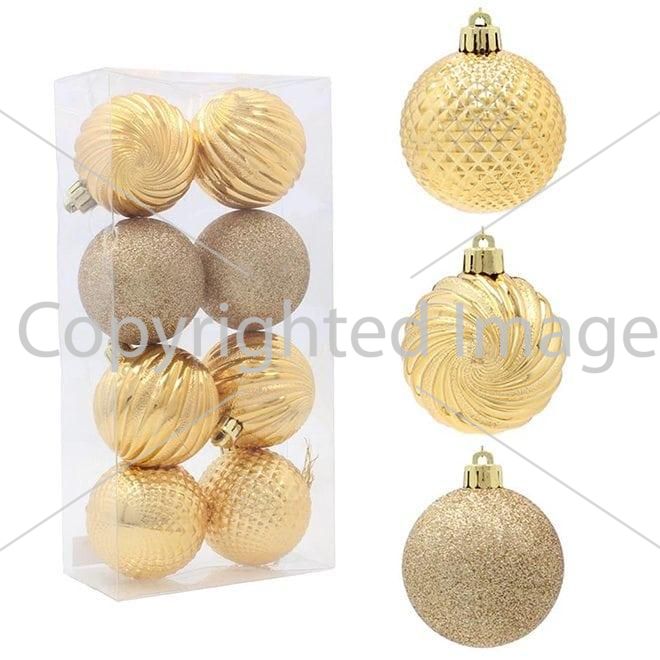 Набір пластикових ялинкових куль, колір - золотий, 8 шт. діаметром - 6 см: фігурний глянцевий - 6 шт. гліттер - 2 шт.