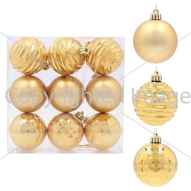 Набор пластиковых елочных шаров, цвет – золотой, 9 шт. диаметром – 6 см: фигурный глянцевый – 6 шт. матовый – 3 шт.