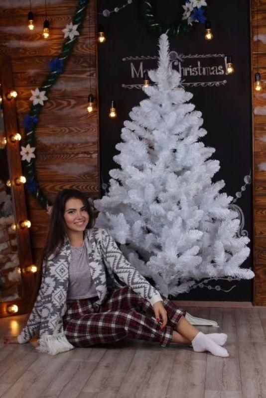 Представленная модель высотой 1,5 метра выполнена из ПВХ белого цвета, длина иголочек составляет 4 см. Она имеет конусную форму с нижним диаметром 100 см и достаточное количество пышных веток, на которые свободно помещаются новогодние игрушки.