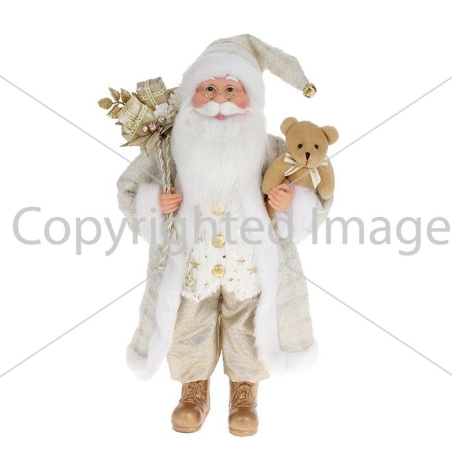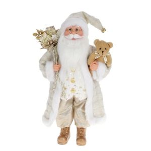 Новогодняя декорация Санта с мишкой цвета шампанья, высотой 40 см. Материал: пластик, ткань.