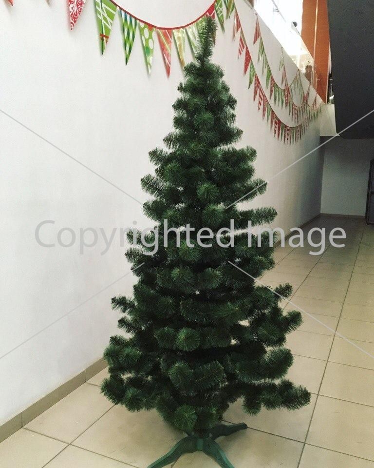 Представленная модель высотой 1 метр выполнена из ПВХ зелёного цвета с белыми кончиками, длина иголочек составляет 5 см. Она имеет конусную форму с нижним диаметром 72 см и достаточное количество пышных веток, на которые свободно помещаются новогодние игрушки.