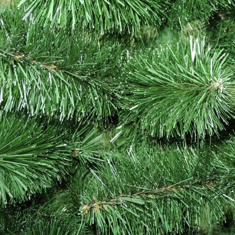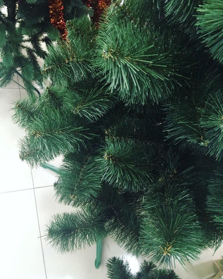 Представленная модель высотой 2,1 метра выполнена из ПВХ зелёного цвета с белыми кончиками, длина иголочек составляет 5 см. Она имеет конусную форму с нижним диаметром 130 см и достаточное количество пышных веток, на которые свободно помещаются новогодние игрушки.