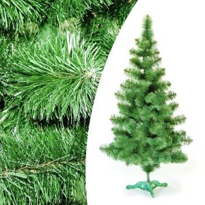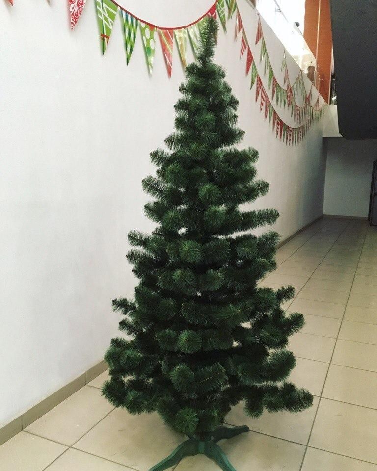 Представленная модель высотой 2.5 метра выполнена из ПВХ зелёного цвета с белыми кончиками, длина иголочек составляет 5 см. Она имеет конусную форму с нижним диаметром 150 см и достаточное количество пышных веток, на которые свободно помещаются новогодние игрушки.