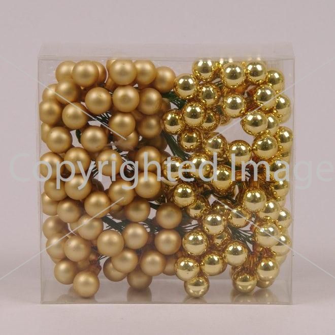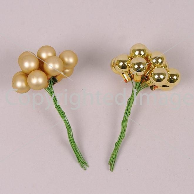 Стеклянные шарики золотого цвета на проволоке образуют небольшой пучок, в нем соединились 12 стеклянных шариков. В упаковке два вида пучков 6 с матовыми шариками и 6 с глянцевыми. Такие маленькие стеклянные шарики обязательно пригодятся флористам и декораторам, собрав их в пучок и дополнив ветвями хвои, бусами, лентами или другим декором, они создадут уникальные новогодние украшения!