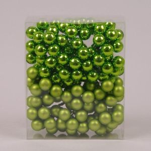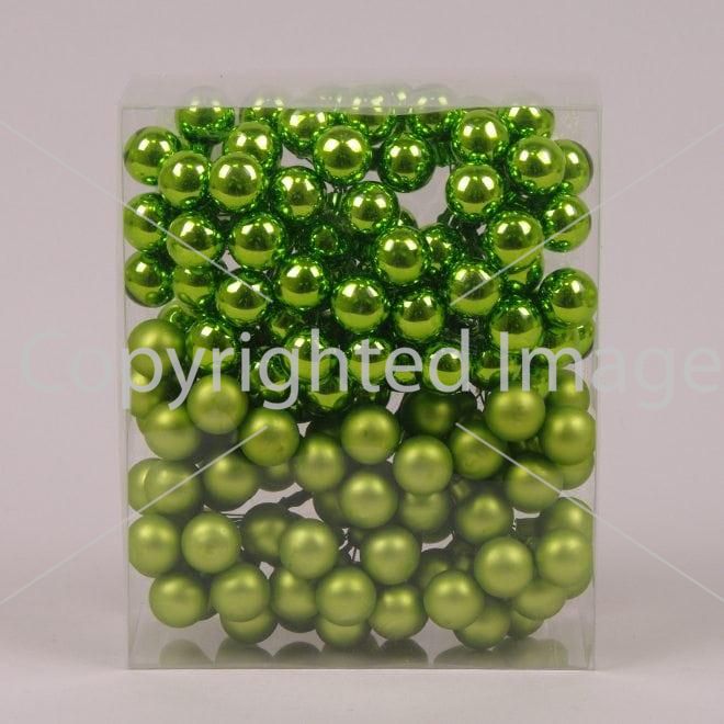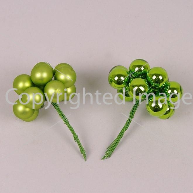 Стеклянные шарики зеленого цвета на проволоке образуют небольшой пучок, в нем соединились 12 стеклянных шариков. В упаковке два вида пучков 6 с матовыми шариками и 6 с глянцевыми. Такие маленькие стеклянные шарики обязательно пригодятся флористам и декораторам, собрав их в пучок и дополнив ветвями хвои, бусами, лентами или другим декором, они создадут уникальные новогодние украшения!
