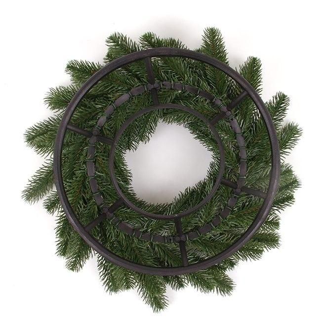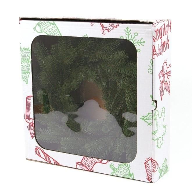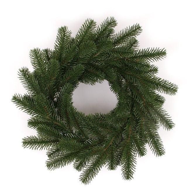 Искусственный литой венок выполнен с максимальной реалистичностью. Хвоя веток сделана из пищевого пластика. Веточки отливаются в особых формах. Он выглядит как живая настоящая ель. Упаковывается в коробку.