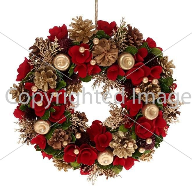 Венок новогодний из шишек, хвои, листьев и цветов с золотыми яблочками, диаметром 35 см. Материал – пенопласт, шишки.