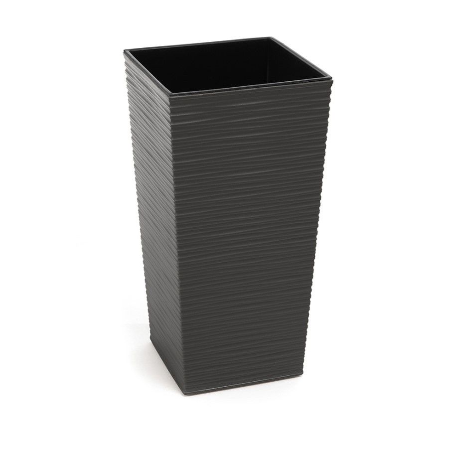 Горщик FINEZJA DLUTO – має сучасний дизайн та універсальне застосування. Він ідеально підходить для оформлення балконів, терас та внутрішніх приміщень. Горщик стійкий до ультрафіолетових променів і має оригінальну поверхню, що імітує різьблення долотом по дереву. Він складається з двох елементів – декоративного корпусу та чорного вкладу.