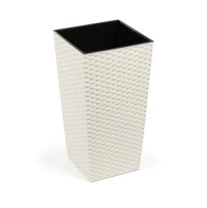 Горщик із вкладом FINEZJA RATTAN – має сучасний дизайн та універсальне застосування. Він ідеально підходить для оформлення балконів, терас та внутрішніх приміщень. Горщик стійкий до ультрафіолетових променів та має оригінальну поверхню, що імітує плетіння раттана. Він складається із двох елементів – декоративного корпусу та чорного вкладу, який може легко вийматися.