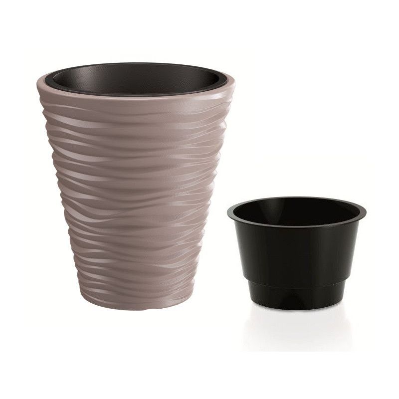 Квітковий горщик Sand з вкладом - виготовлений з якісного пластику, стійкого до дії сонячних променів та вологи. Він легкий і стійкий, має модний дизайн та гарне забарвлення. Елегантний рифлений візерунок і приємний глянсовий блиск надають особливого шарму та ошатності. Горщик підійде для декорування тераси, балкону, кафе чи квартири. Внутрішній внесок зробить посадку рослини та догляд за нею легше та зручніше.