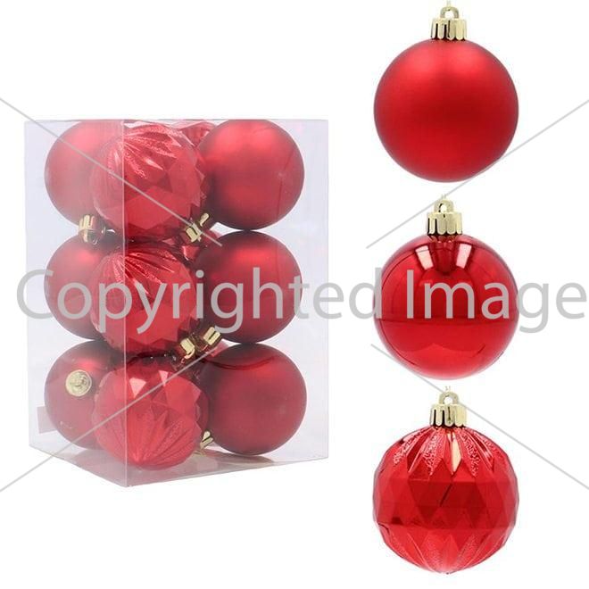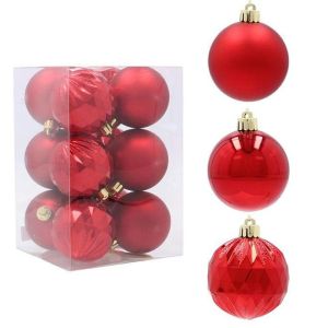 Набір пластикових ялинкових куль, колір червоний, 12 шт. діаметром - 6 см: 3 шт. - глянець, 3 шт. - Фігурний, 6 шт. - Матовий.