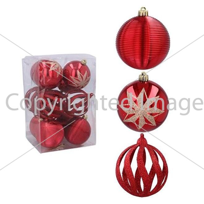 Набір пластикових ялинкових куль, колір червоний, 12 шт. діаметром - 8 см: 4 шт. - глянець з візерунком, 4 шт. - Глянсовий фігурний, 4 шт. - Фігурний гліттер.